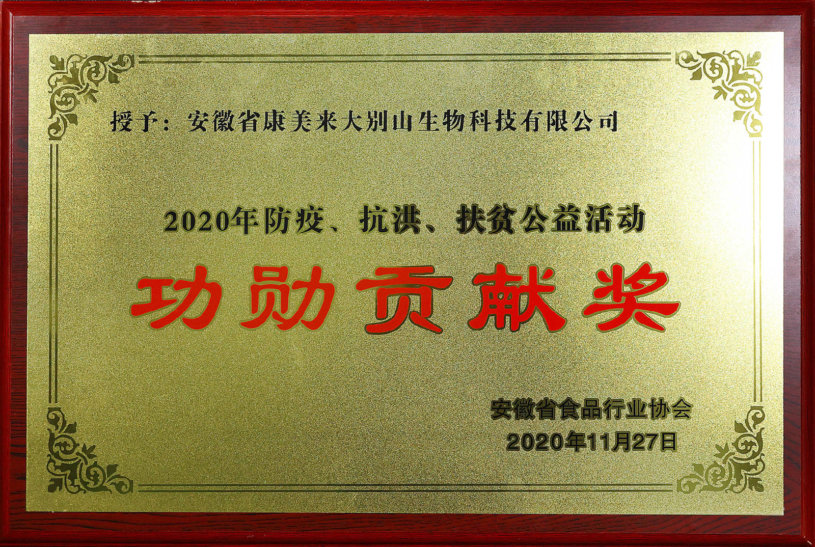 2020年11月27日,2020年度安徽省食品行業(yè)“防疫、抗洪、扶貧”公益表彰大會 在安徽合肥濱湖會展中心舉行。安徽省食品行業(yè)協(xié)會根據(jù)康美來公司在2020年防疫、抗洪、扶貧方面的突出貢獻,授予安徽省康美來大別山生物科技有限公司“2020年防疫、抗洪、扶貧公益活動功勛貢獻獎”稱號。