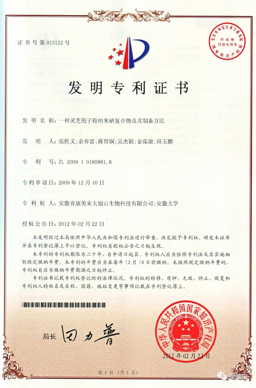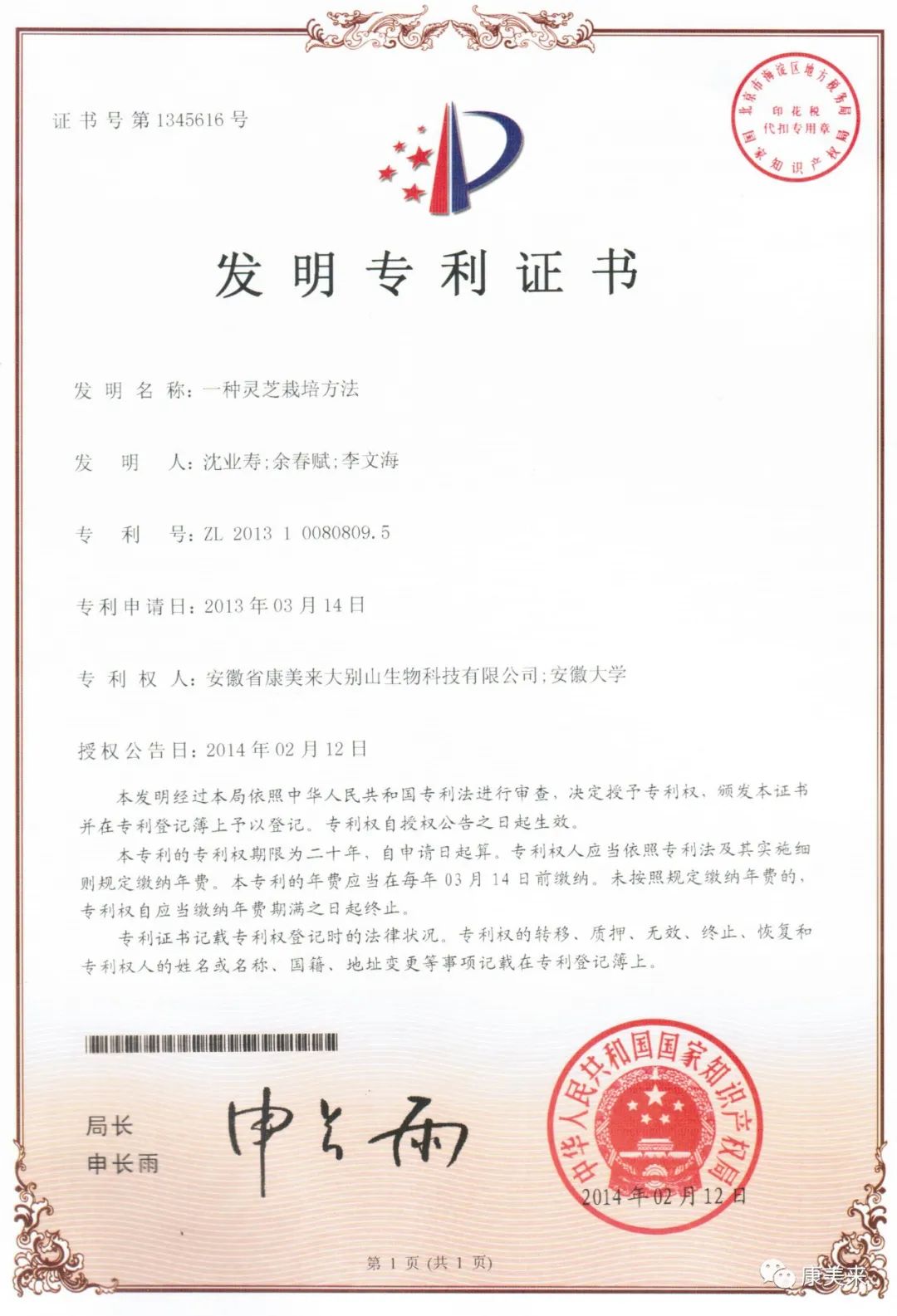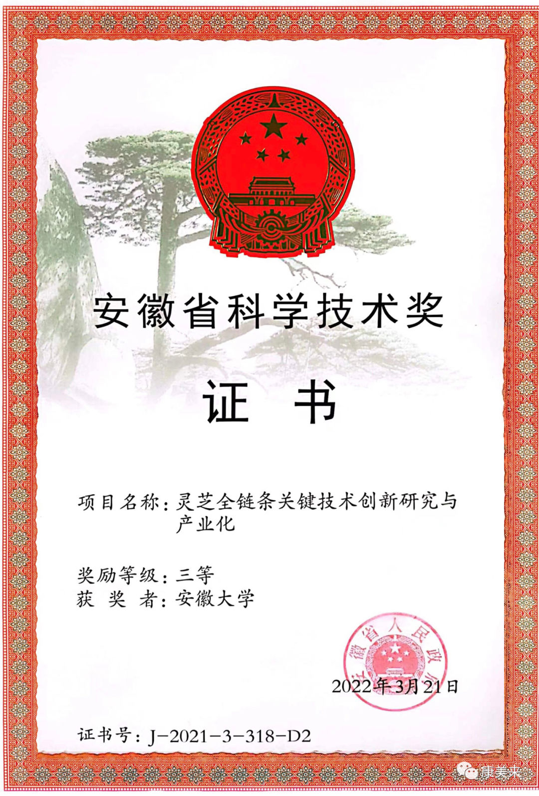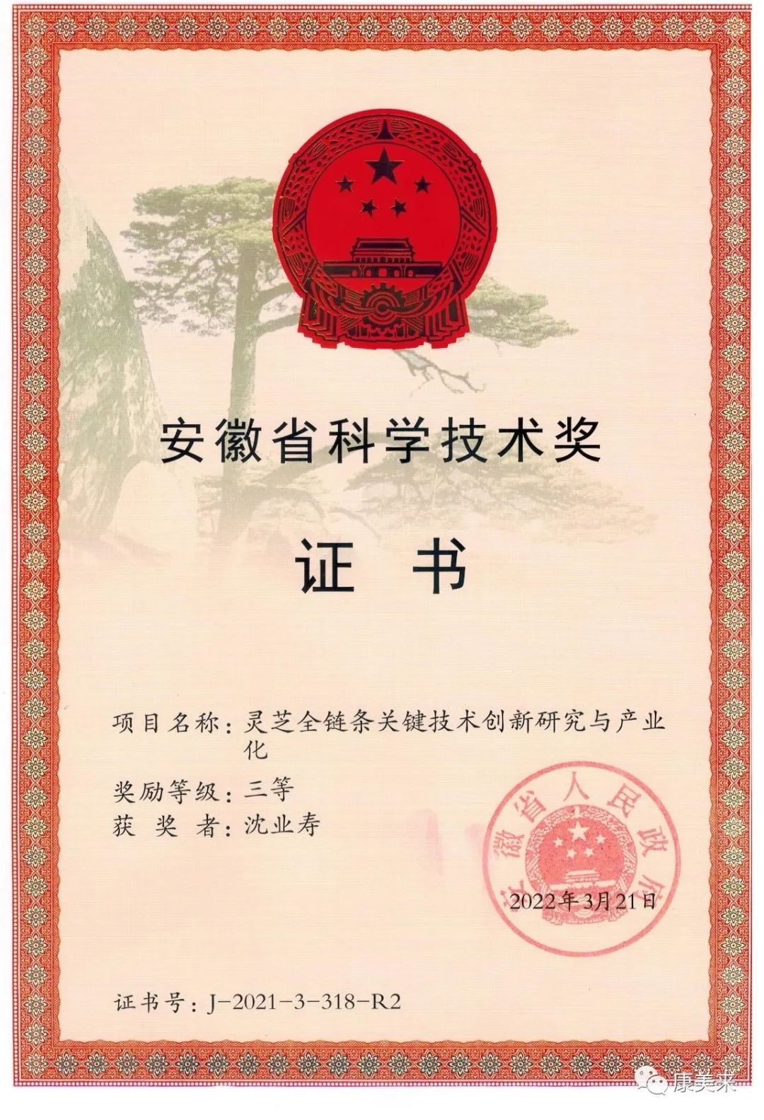 安徽省人民政府向安徽省康美來大別山生物科技有限公司、安徽大學沈業壽教授等單位和個人頒發“安徽省科技技術獎”證書,這是康美來公司與安徽大學開展產學研合作十五年在大別山靈芝研究領域取得的重大成就,得到省、市、縣政府的高度肯定。