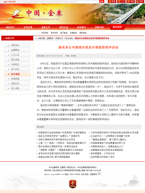 2015年4月23日,我縣現代產業園區康美來科技有限公司開展捐資助學活動,縣扶貧辦組織燕子河鎮樹林小學、桃嶺鄉關山小學、沙河鄉中心小學三所學校的師生代表參加活動儀式。自2004年到我縣投資靈芝深加工項目成立公司以來,康美來公司連續9年在我縣開展捐資助學活動,共結對幫扶了184名貧困學生,每年為每名學生捐助600元,直至畢業,總計捐款60多萬元。